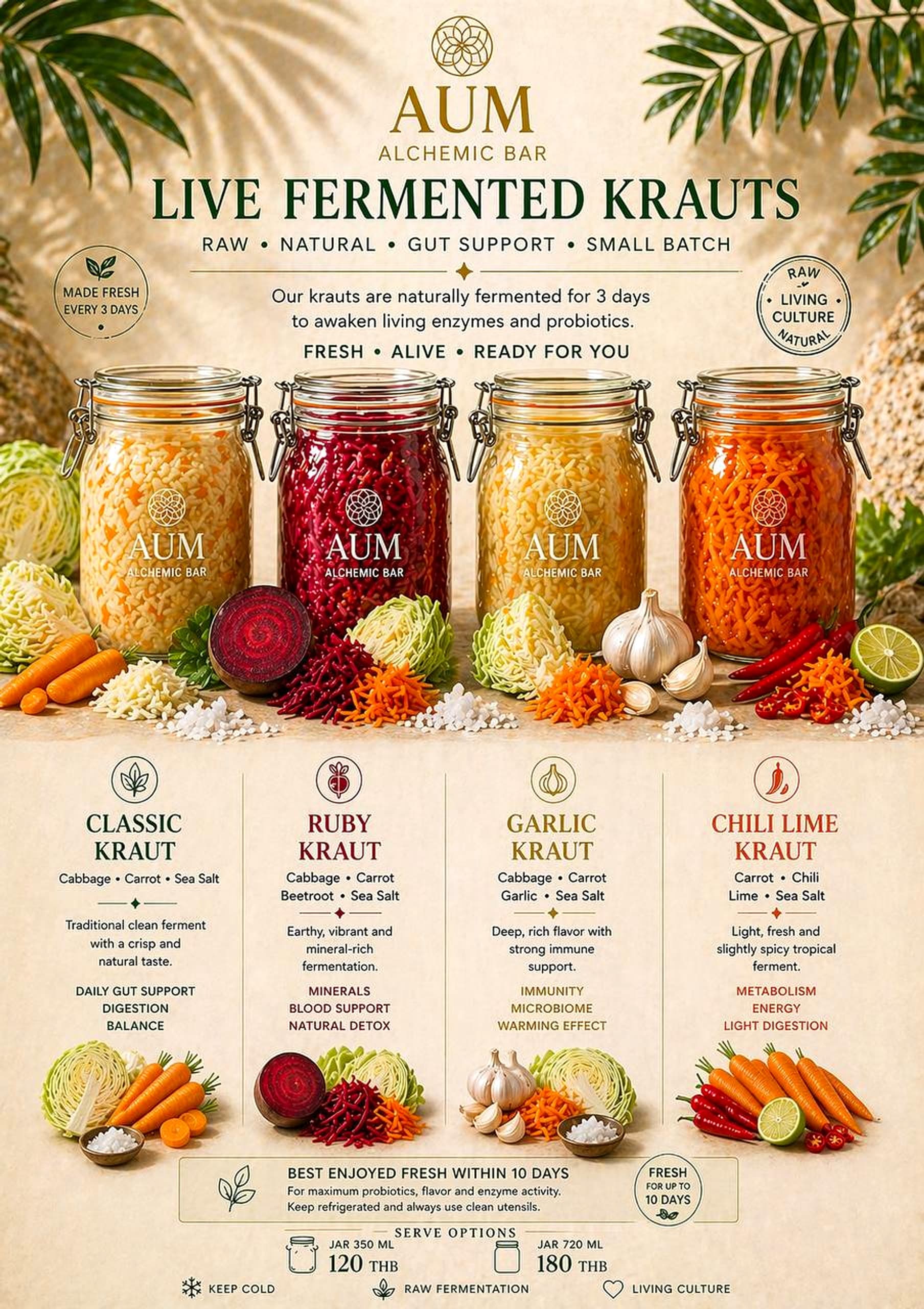 We use only three ingredients per base recipe: vegetables grown in Thailand, hand-harvested sea salt, and time. No vinegar, no sugar, no starter cultures from a lab. The cabbage's own microbes do the work over three weeks.